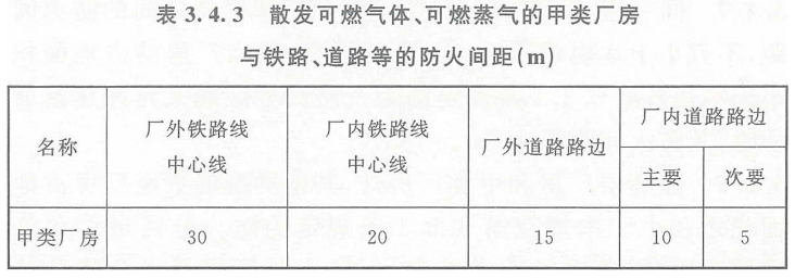 散发可燃气体、可燃蒸气的甲类厂房与铁路、道路等的防火间距不应小于表3.4.3的规定,但甲类厂房所属厂内铁路装卸线当有安全措施时,防火间距不受表3.4.3规定的限制。