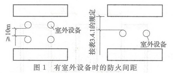 本条主要规定了厂房外设置化学易燃物品的设备时,与相邻厂房、设备的防火间距确定方法,如图1。装有化学易燃物品的室外设备,当采用不燃材料制作的设备时,设备本身可按相当于一、二级耐火等级的建筑考虑。室外设备的外壁与相邻厂房室外设备的防火间距,不应小于10m;与相邻厂房外墙的防火间距,不应小于本规范第3.4.1条~第3.4.4条的规定,即室外设备内装有甲类物品时,与相邻厂房的间距不小于12m;装有乙类物品时,与相邻厂房的间距不小于10m。