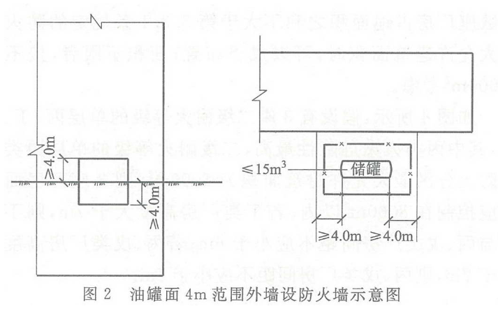 小型可燃液体中间罐常放在厂房外墙附近,为安全起见,要求可能受到火灾作用的部分外墙采用防火墙,并提倡将储罐直接埋地设置。条文“面向储罐一面4.0m范围内的外墙为防火墙”中“4.0m范围”的含义是指储罐两端和上下部各4m范围,见图2。