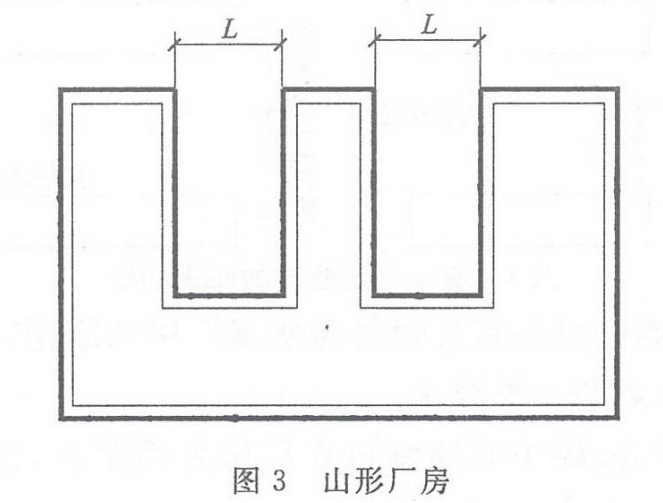 对于图3所示的“山形”、“凵形”等类似形状的厂房,建筑的两翼相当于两座厂房。本条规定了建筑两翼之间的防火间距(L),主要为便于灭火救援和控制火势蔓延。但整个厂房的占地面积不大于本规范第3.3.1条规定的一个防火分区允许最大建筑面积时,该间距L可以减小到6m。