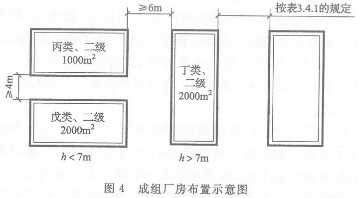 组内厂房之间规定4m的最小间距,主要考虑消防车通行需要,也是考虑灭火救援的需要。当厂房高度为7m时,假定消防员手提水枪往上成60°角,就需要4m的水平间距才能喷射到7m的高度,故以高度7m为划分的界线,当大于7m时,则应至少需要6m的水平间距。