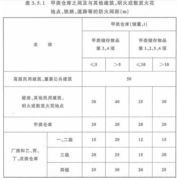 注:甲类仓库之间的防火间距,当第3、4项物品储量不大于2t,第1、2、5、6项物品储量不大于5t时,不应小于12m,甲类仓库与高层仓库的防火间距不应小于13m。