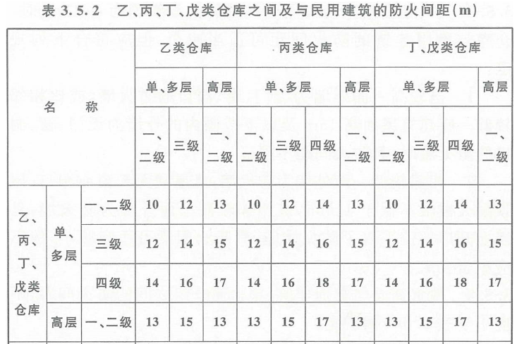 除本规范另有规定外,乙、丙、丁、戊类仓库之间及与民用建筑的防火间距,不应小于表3.5.2的规定。