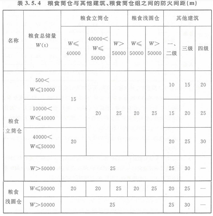 粮食筒仓与其他建筑、粮食筒仓组之间的防火间距,不应小于表3.5.4的规定。