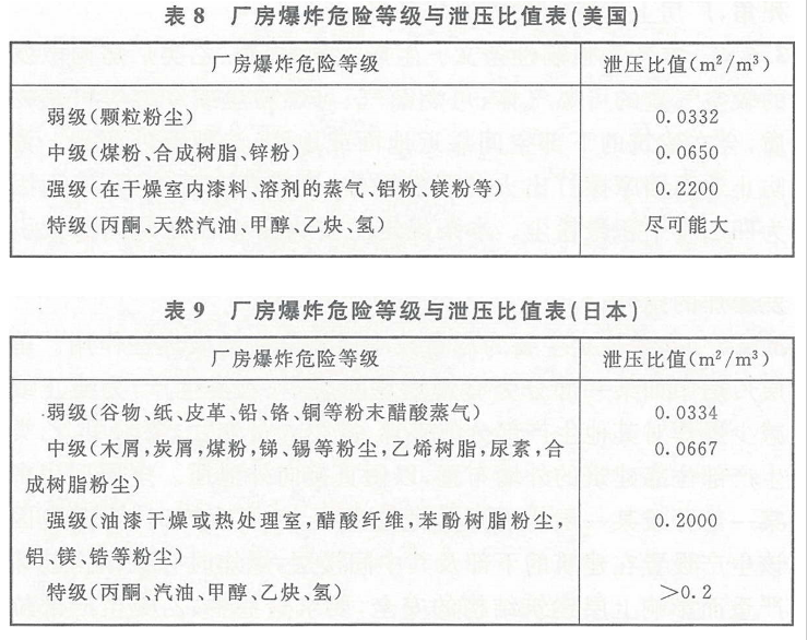本条规定参照了美国消防协会标准《爆炸泄压指南》NFPA68的相关规定和公安部天津消防研究所的有关研究试验成果。在过去的工程设计中,存在依照规范设计并满足规范要求,而可能不能有效泄压的情况,本条规定的计算方法能在一定程度上解决该问题。有关爆炸危险等级的分级参照了美国和日本的相关规定,见表8和表9;表中未规定的,需通过试验测定。
