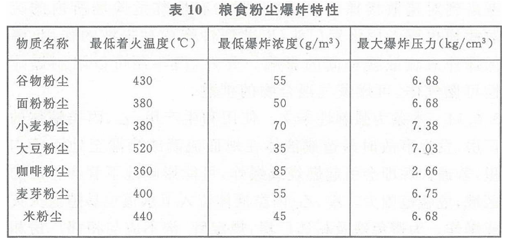 3.6.13谷物粉尘爆炸事故屡有发生,破坏严重,损失很大。谷物粉尘爆炸必须具备一定浓度、助燃剂(如氧气)和火源三个条件。表10列举了一些谷物粉尘的爆炸特性。
