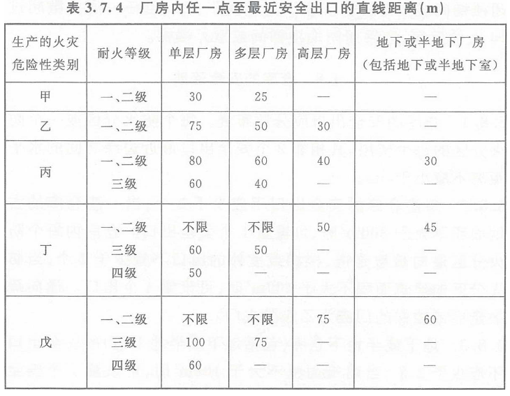 厂房内任一点至最近安全出口的直线距离不应大于表3.7.4的规定。