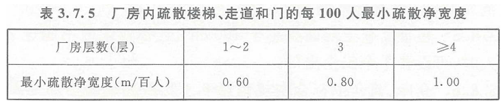 厂房内疏散楼梯、走道、门的各自总净宽度,应根据疏散人数按每100人的最小疏散净宽度不小于表3.7.5的规定计算确定。但疏散楼梯的最小净宽度不宜小于1.10m,疏散走道的最小净宽度不宜小于1.40m,门的最小净宽度不宜小于0.90m。当每层疏散人数不相等时,疏散楼梯的总净宽度应分层计算,下层楼梯总净宽度应按该层及以上疏散人数最多一层的疏散人数计算。