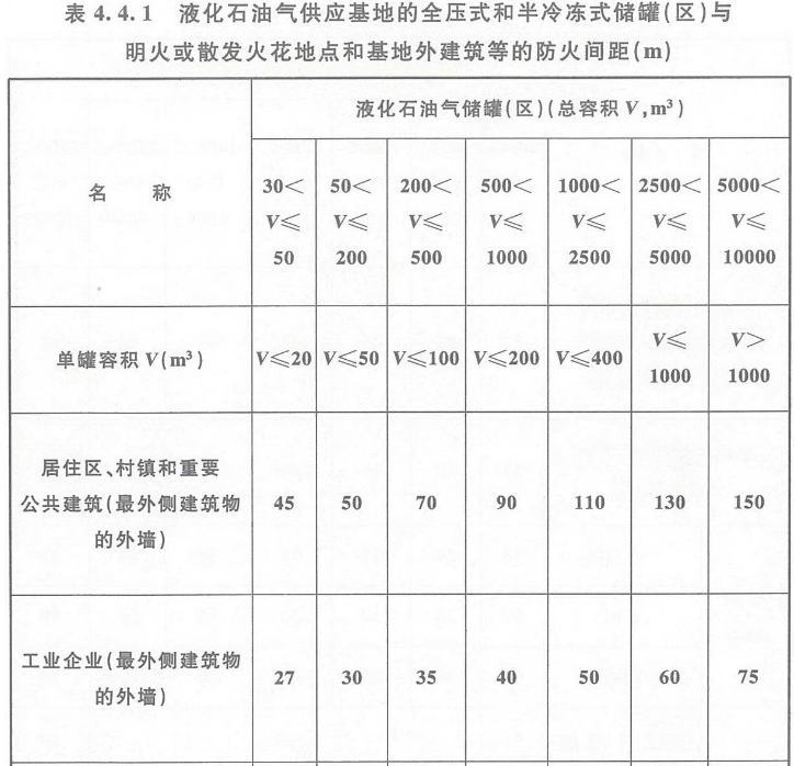 液化石油气供应基地的全压式和半冷冻式储罐(区),与明火或散发火花地点和基地外建筑等的防火间距不应小于表4.4.1的规定,与表4.4.1未规定的其他建筑的防火间距应符合现行国家标准《城镇燃气设计规范》GB
