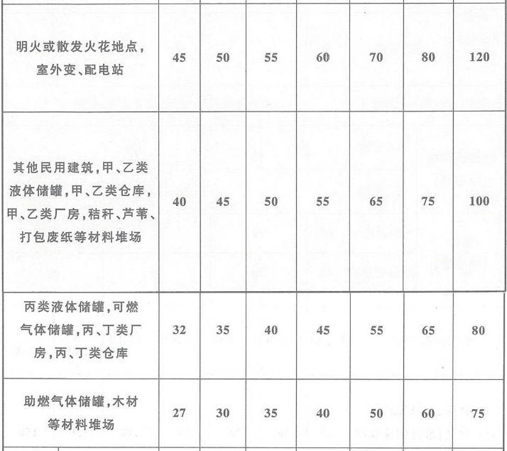 在日本,液化石油气站储罐的平均容积很小,当按上式计算大于30m时,可取不小于30m。当采用地下储罐或采取水喷淋、防火墙等安全措施时、其防火间距可以按该规范的有关规定减小距离。对于液化石油气储罐与站内建筑物的防火间距,日本的规定也很小:与明火、耐火等级较低的建筑物的间距不应小于8m,与非明火建筑、站内围墙的间距不应小于3.0m。