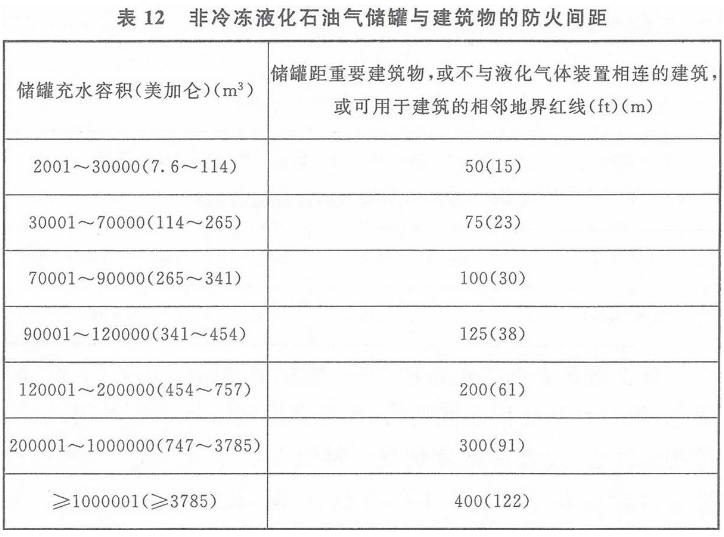 注:储罐与用气厂房的间距可按上表减少50%,但不得低于50ft(15m)表中数字后括号内的数值为按公制单位换算值。1