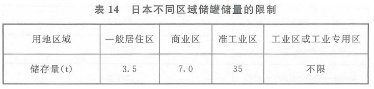 日本液化石油气设备协会《一般标准》JLPA001:2002的规定:第一种居住用地范围内,不允许设置液化石油气储罐;其他用地区域,设置储罐容量有严格限制。在此基础上,规定了地上储罐与第一种保护对象(学校、医院、托幼院、文物古迹、博物馆、车站候车室、百货大楼、酒店、旅馆等)的距离按下式计算确定: