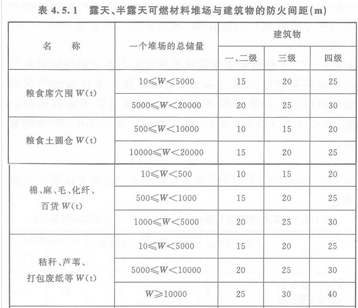 露天、半露天可燃材料堆场与建筑物的防火间距不应小于表4.5.1的规定。