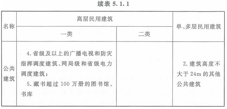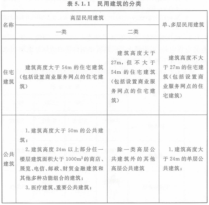民用建筑根据其建筑高度和层数可分为单、多层民用建筑和高层民用建筑。高层民用建筑根据其建筑高度、使用功能和楼层的建筑面积可分为一类和二类。民用建筑的分类应符合表5.1.1的规定。