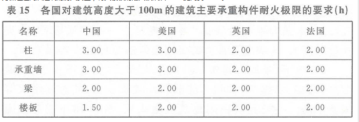 构件耐火性能、安全疏散和消防救援等均与建筑高度有关。对于建筑高度大于100m的建筑,其主要承重构件的耐火极限要求对比情况见表15。从表15可以看出,我国规范中有关柱、梁、承重墙等承重构件的耐火极限要求与其他国家的规定比较接近,但楼板的耐火极限相对偏低。由于此类高层建筑火灾的扑救难度巨大,火灾延续时间可能较长,为保证超高层建筑的防火安全,将其楼板的耐火极限从1.50h提高到2.00h。
