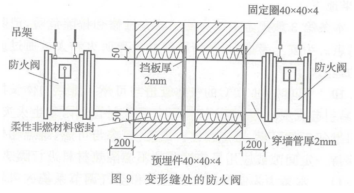 在穿越变形缝的两侧风管上。在该部位两侧风管上各设一个防火阀,主要为使防火阀在一定时间里达到耐火完整性和耐火稳定性要求,有效地起到隔烟阻火作用,参见图9。