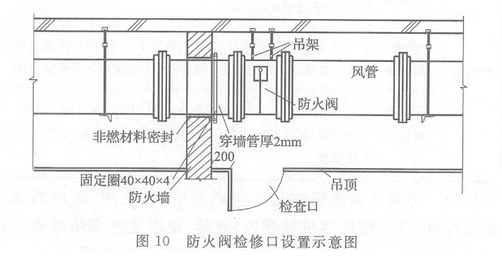为使防火阀能及时关闭,控制防火阀关闭的易熔片或其它感温元件应设在容易感温的部位。设置防火阀的通风管要求具备一定强度,设置防火阀处要设置单独的支吊架,以防止管段变形。在暗装时,需在安装部位设置方便检修的检修口,参见图10。