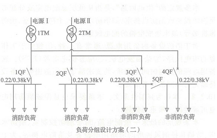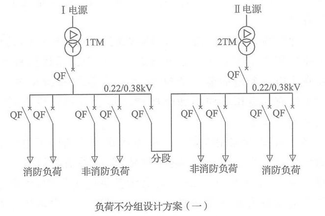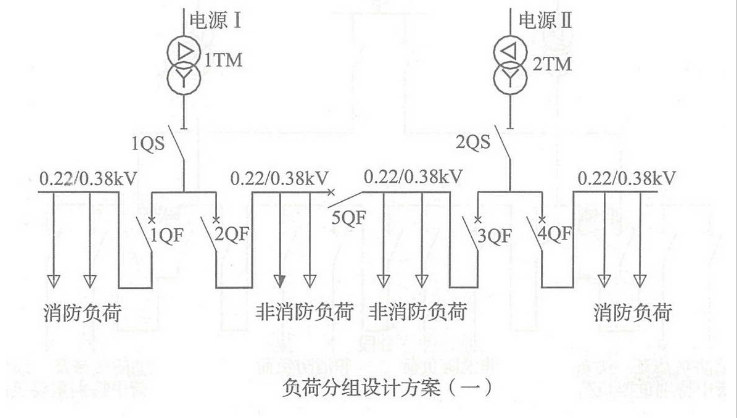如果生产、生活用电与消防用电的配电线路采用同一回路,火灾时,可能因电气线路短路或切断生产、生活用电,导致消防用电设备不能运行,因此,消防用电设备均应采用专用的供电回路。同时,消防电源宜直接取自建筑内设置的配电室的母线或低压电缆进线,且低压配电系统主接线方案应合理,以保证当切断生产、生活电源时,消防电源不受影响。