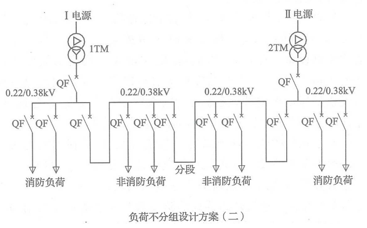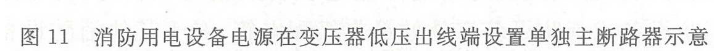 对于建筑的低压配电系统主接线方案,目前在国内建筑电气工程中采用的设计方案有不分组设计和分组设计两种。对于不分组方案,常见消防负荷采用专用母线段,但消防负荷与非消防负荷共用同一进线断路器或消防负荷与非消防负荷共用同一进线断路器和同一低压母线段。这种方案主接线简单、造价较低,但这种方案使消防负荷受非消防负荷故障的影响较大;对于分组设计方案,消防供电电源是从建筑的变电站低压侧封闭母线处将消防电源分出,形成各自独立的系统,这种方案主接线相对复杂,造价较高,但这种方案使消防负荷受非消防负荷故障的影响较小,图11给出了几种接线方案的示意做法。