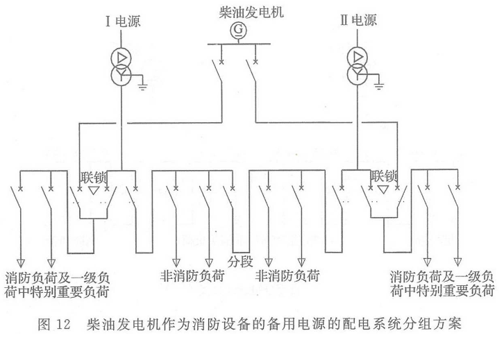 当采用柴油发电机作为消防设备的备用电源时,要尽量设计独立的供电回路,使电源能直接与消防用电设备连接,参见图12。