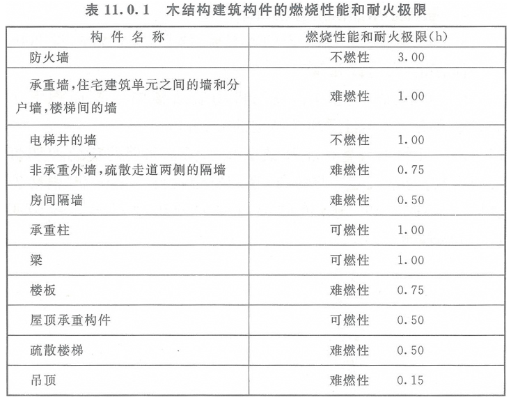 木结构建筑的防火设计可按本章的规定执行。建筑构件的燃烧性能和耐火极限应符合表11.0.1的规定。