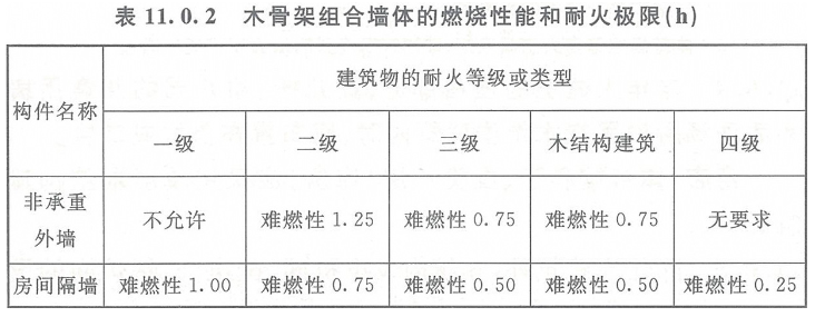 木骨架组合墙体的燃烧性能和耐火极限应符合表11.0.2的规定,其他要求应符合现行国家标准《木骨架组合墙体技术规范》GB/T 50361的规定。