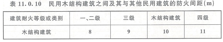 民用木结构建筑之间及其与其他民用建筑的防火间距不应小于表11.0.10的规定。