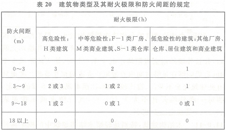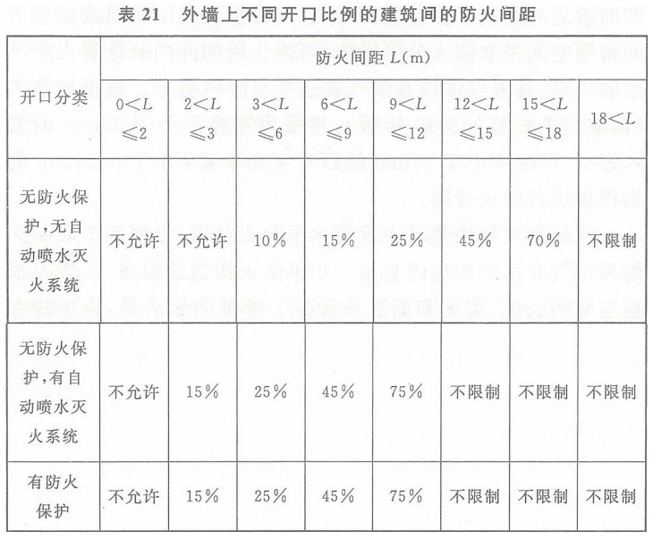 试验证明,发生火灾的建筑对相邻建筑的影响与该建筑物外墙的耐火极限和外墙上的门、窗或洞口的开口比例有直接关系。美国《国际建筑规范》(2012年版)对建筑物类型及其耐火性能和防火间距的规定见表20,对外墙上不同开口比例的建筑间的防火间距的规定见表21。