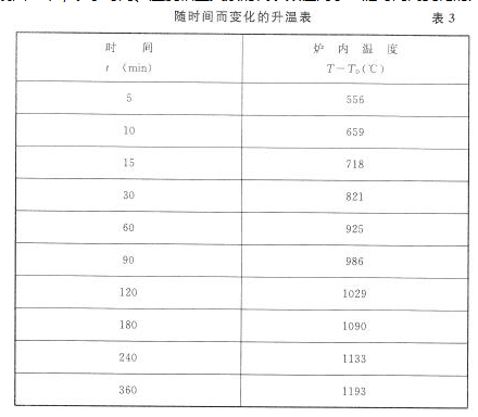一、标准升温。试验时炉内温度的上升随时间而变化,如图1及表3。