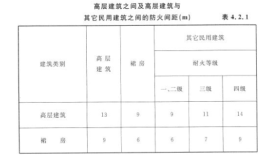 一、满足消防扑救需要。扑救高层建筑火灾需要使用消防水罐车、曲臂车、云梯登高消防车等车辆。消防车辆停靠、通行、操作,结合火灾实践经验,满足高层建筑火灾扑救,本条规定高层主体建筑之间的防火间距不应小于13m;与其它三、四级的低层民用建筑之间的防火间距,因耐火等级低,火势蔓延威胁大,故防火间距较一、二级建筑相应提高为11m与14m