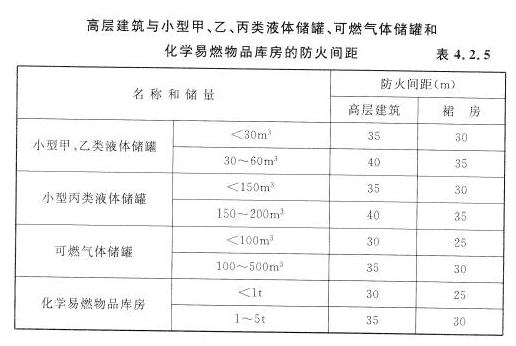 4.2.5 高层建筑与小型甲、乙、丙类液体储罐、可燃气体储罐和化学易燃物品库房的防火间距,不应小于表4.2.5的规定。