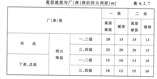 一、高层建筑不宜布置在甲、乙类厂房附近,如丙、丁、戊类的厂房、库房等必须布置时,其防火间距应符合表4.2.7的规定。
