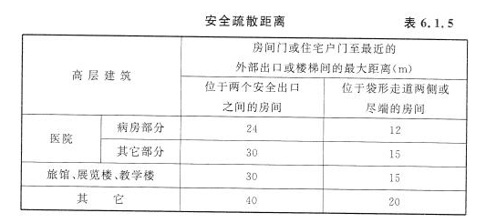 6.1.5 高层建筑的安全出口应分散布置,两个安全出口之间的距离不应小于5.00m。安全疏散距离应符合表6.1.5的规定。
