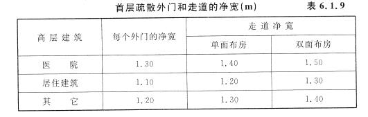 对外门和走道的最小规定,是根据国内高层民用建筑走道和外门净宽度的实际情况,并参考国外的规定提出的。一般都不小于本规范表6.1.9所规定的数字。