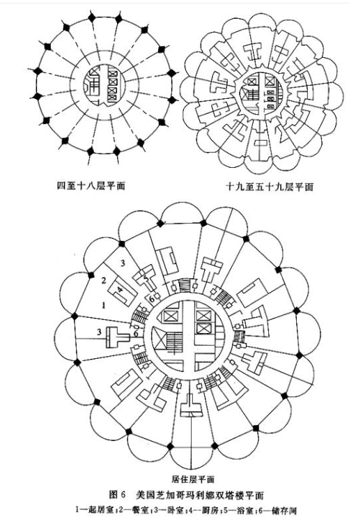 世界著名的美国芝加哥玛利娜双塔楼,是两座各为五十九层、高177m的塔楼,其下部十八层为汽车库,十九层是机房,再上面有四十层住宅,如图6所示。塔中心是剪刀楼梯。