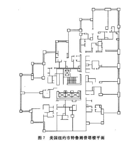 20世纪80年代建成的美国纽约市特鲁姆普塔楼,塔楼高五十八层,底层是商场,上部是住宅,楼梯间设置剪刀楼梯,如图7所示。