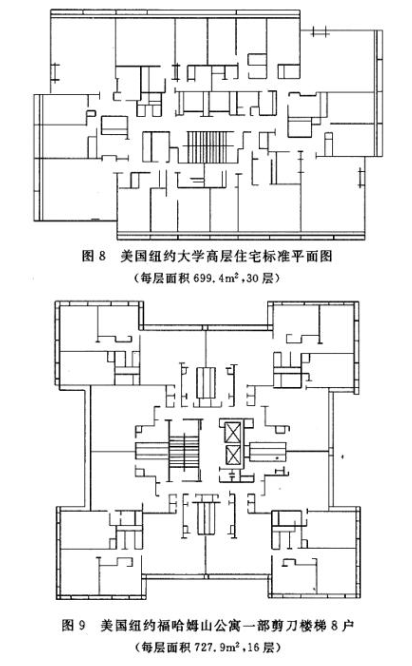 高层住宅受面积指标限制,又要满足功能使用上的要求,平面设计上要求经过防烟前室,再进入楼梯间,有些情况下十分困难。编写规范过程中,收集到不少国内外采用剪刀楼梯的高层住宅实例,摘录一部分来说明这个问题。美国纽约大学三十层的住宅,如图8。美国福哈姆山公寓,高十六层,如图9。