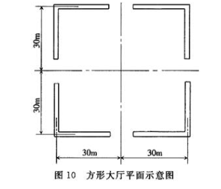 以图10为例,按正方形大厅来确定中心点到四个出口的距离都能达到30m,这个厅的最大面积是60m×60m=3600m2。与放宽的商业营业厅、展览厅的防火分区面积相一致,有利于贯彻执行。