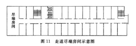 位于走道尽端,面积在75m2以内的房间,属于较大的房间。受平面布置的限制,有些情况下,如图11所示,不能开两个门。针对这样的具体情况,本条作了放宽,规定当门的宽度不小于1.40m时,允许设一个门。这可以使2~3股人流顺利疏散出来。