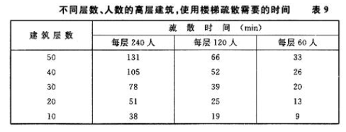 一、高度100m以上的建筑物,一旦遇有火灾,要将建筑内的人员完全疏散到室外比较困难。加拿大有关研究部门提出以下数据,使用一座宽1.10m的楼梯,将高层建筑的人员疏散到室外,所用时间见表9。