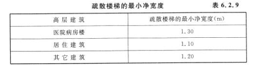 二、实际工程中有些高层建筑的楼层面积较大,但人数并不多。如按每100人1.00m宽度指标计算,设计宽度可能会不足1.10m。出现这种情况时,楼梯宽度应按本规范表6.2.9的规定进行设计。这是因为《民用建筑设计通则》JGJ37—87第4.2.1条第二款规定“梯段净宽度除应符合防火规范的规定外……,并不应少于两股人流。”考虑到不同建筑功能要求上的差别,本规定作出不同最小宽度的规定。
