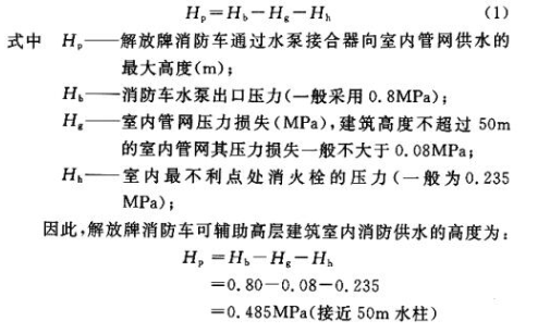 二、高层建筑的高度不同对消防用水量有不同的要求。建筑高度越高火势垂直蔓延的可能性也越大,消防扑救工作也就越困难。目前消防登高车最大工作高度一般为30~48m,国产0023型曲臂登高消防车的最大工作高度为23m。我国消防队较广泛使用解放牌消防车和麻质水带,在建筑高度不超过50m时,可以利用解放牌消防车通过水泵接合器向室内管网供水,仍可加强室内消防给水系统的供水能力。解放牌消防车通过水泵接合器的供水高度为: