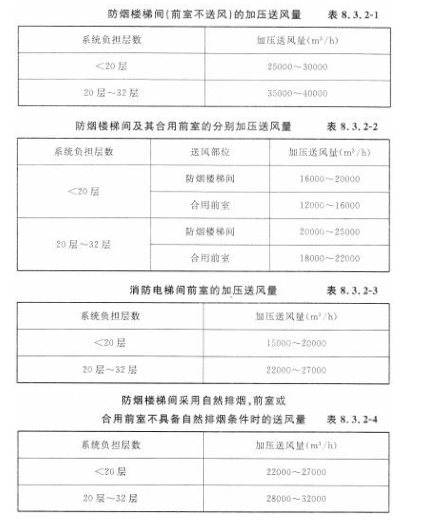 8.3.2 高层建筑防烟楼梯间及其前室、合用前室和消防电梯间前室的机械加压送风量应由计算确定,或按表8.3.2-1至表8.3.2-4的规定确定。当计算值和本表不一致时,应按两者中较大值确定。
