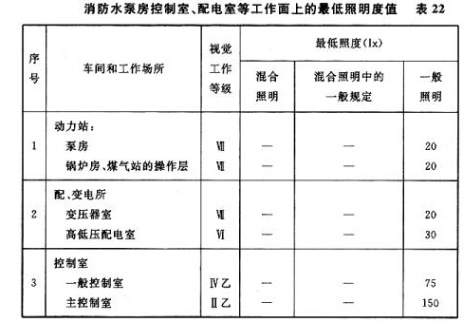 消防控制室、消防水泵房、配电室和自备发电机房要在高层建筑内任何部位发生火灾时坚持正常工作,这些部位应急照明的最低照度应与该部位工作面上的正常工作照明的最低照度相同,其有关数值见表22。表22中数值引自《工业企业照明设计标准》。