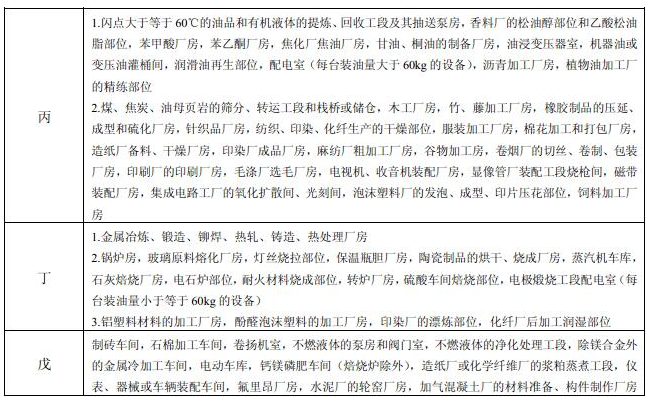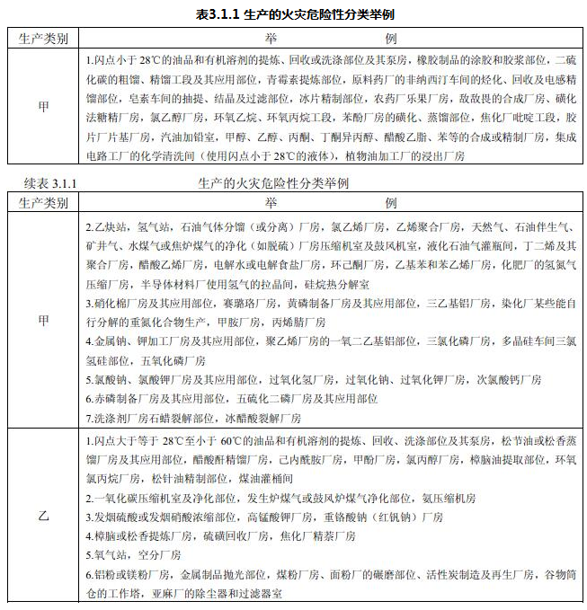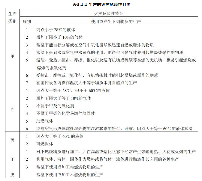 生产的火灾危险性应根据生产中使用或产生的物质性质及其数量等因素,分为甲、乙、丙、丁、戊类,并应符合表3.1.1的规定。