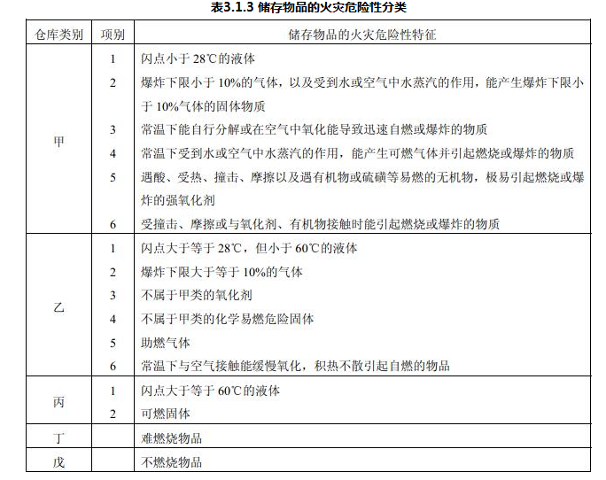 储存物品的火灾危险性应根据储存物品的性质和储存物品中的可燃物数量等因素,分为甲、乙、丙、丁、戊类,并应符合表3.1.3的规定。