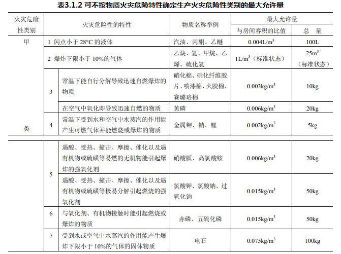 表3.1.2列出了部分生产中常见的甲、乙类火灾危险性物品的最大允许量。本表仅供使用本条文时参考。现将其计算方法和数值确定的原则及应用本表应注意的事项说明如下: