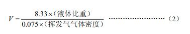 公式(2)中液体的比重,以水的比重为1;挥发性气体的密度,以空气的密度为1;V表示挥发气的气体体积,单位为ft3。公式(1)为公式(2)换算为公制单位后的表达式。