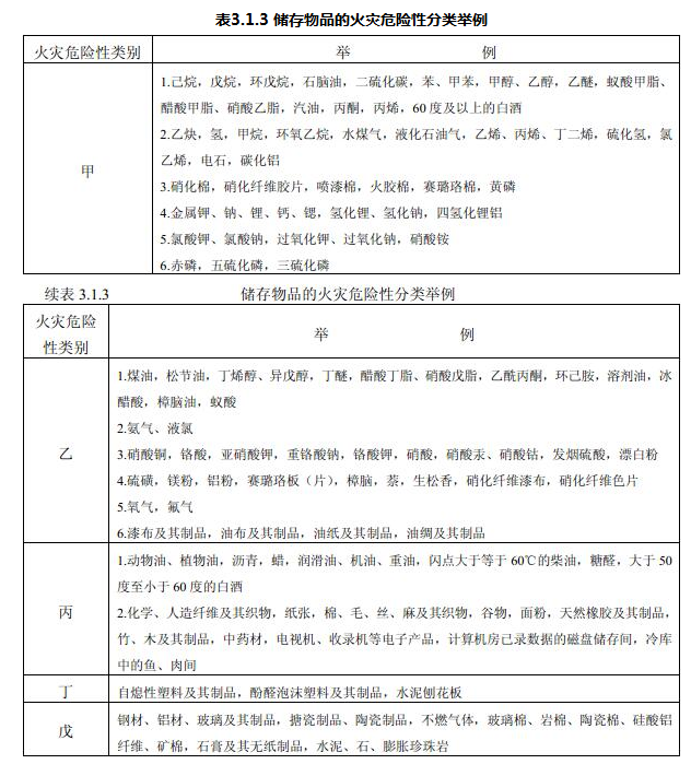 表3.1.3列举了一些常见储存物品的火灾危险性分类,供设计时参考。