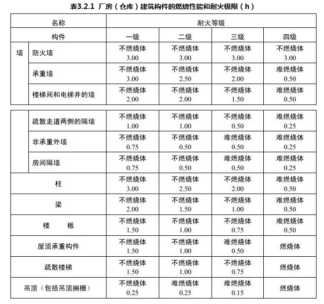 厂房(仓库)的耐火等级可分为一、二、三、四级。其构件的燃烧性能和耐火极限除本规范另有规定者外,不应低于表3.2.1的规定。